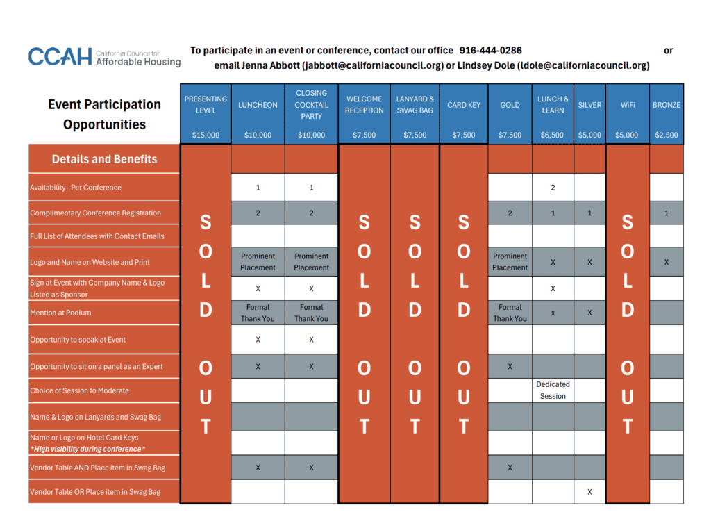 Attending CCAH as a sponsor puts your company in front of industry leaders, policy makers, and stakeholders who are leading development of affordable housing in California. Sponsors gain brand exposure through logo placement, event signage, podium opportunities and promotion on digital platforms.